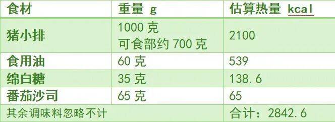 我们来大致(zhi)计算一下热量(liang),约为2842.6千卡(ka),相比于单纯的猪小排,翻了近1.5倍,这还没(mei)有(you)算长时间烹(peng)煮时骨头(tou)中溶出的脂肪带来的热量(liang)。