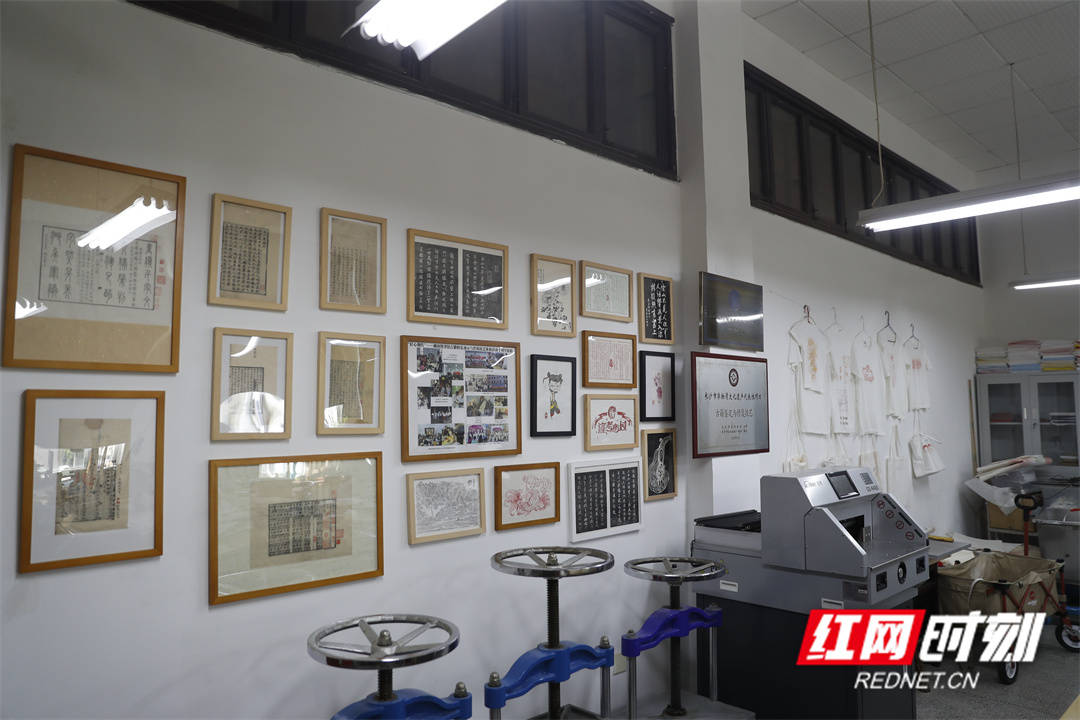 湖(hu)南藏书楼古籍修复室的出口处(chu)展示着古籍仿真复制书页以及雕版印刷文创(chuang)产物。