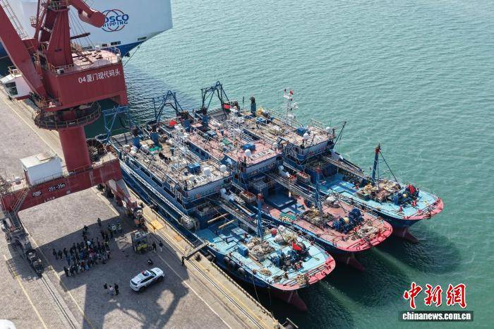 3月17日,“福远渔081”“福远渔083”“福远渔085”三艘远洋渔船(chuan)靠泊厦门港现代码头。 胡(hu)嘉睿 摄