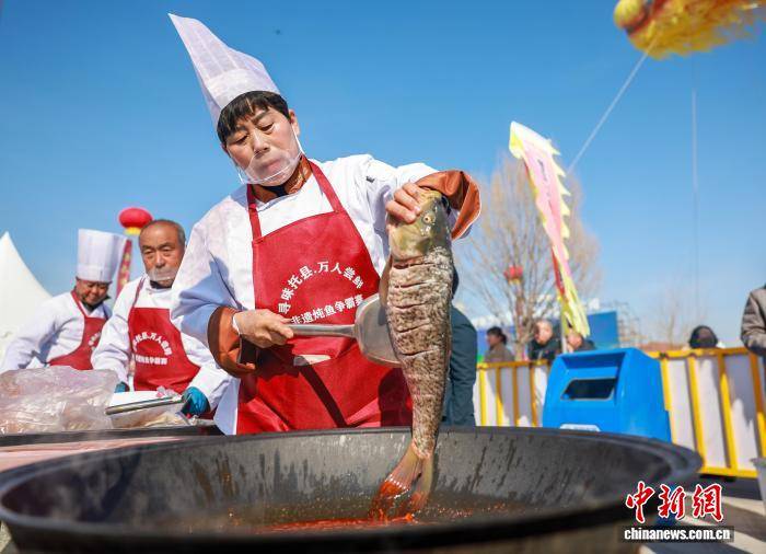 3月20日(ri),内蒙古托克(ke)托县,炖鱼争霸赛中,参赛选手任秀(xiu)清将一条黄河鲤放入锅中。 中新社记者 张玮 摄