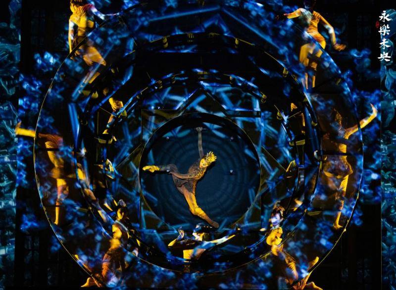 舞剧的多个选段堪称“文物起舞”的典范:舞蹈《璇玑万(wan)象》的创作灵感源于永乐宫(gong)三清殿穹顶的藻井结构。十二名女舞者于三层立面“斗八藻井”装置中,以刚柔相济(ji)的肢体动作,建(jian)构出藻井的繁复纹(wen)样,彩(cai)绘团龙在底层中央盘曲灵动,配合影像(xiang)勾勒出“动态”藻井缓缓旋转(zhuan),融(rong)汇(hui)成一场装置艺术、肢体语言与(yu)数字影像(xiang)交织(zhi)的视觉诗篇。“这段编舞不仅展现了古建(jian)筑(zhu)的恢宏气势,也巧妙呼应了‘天圆地方’的东方哲学。”总编导谢(xie)元(yuan)臻介绍。